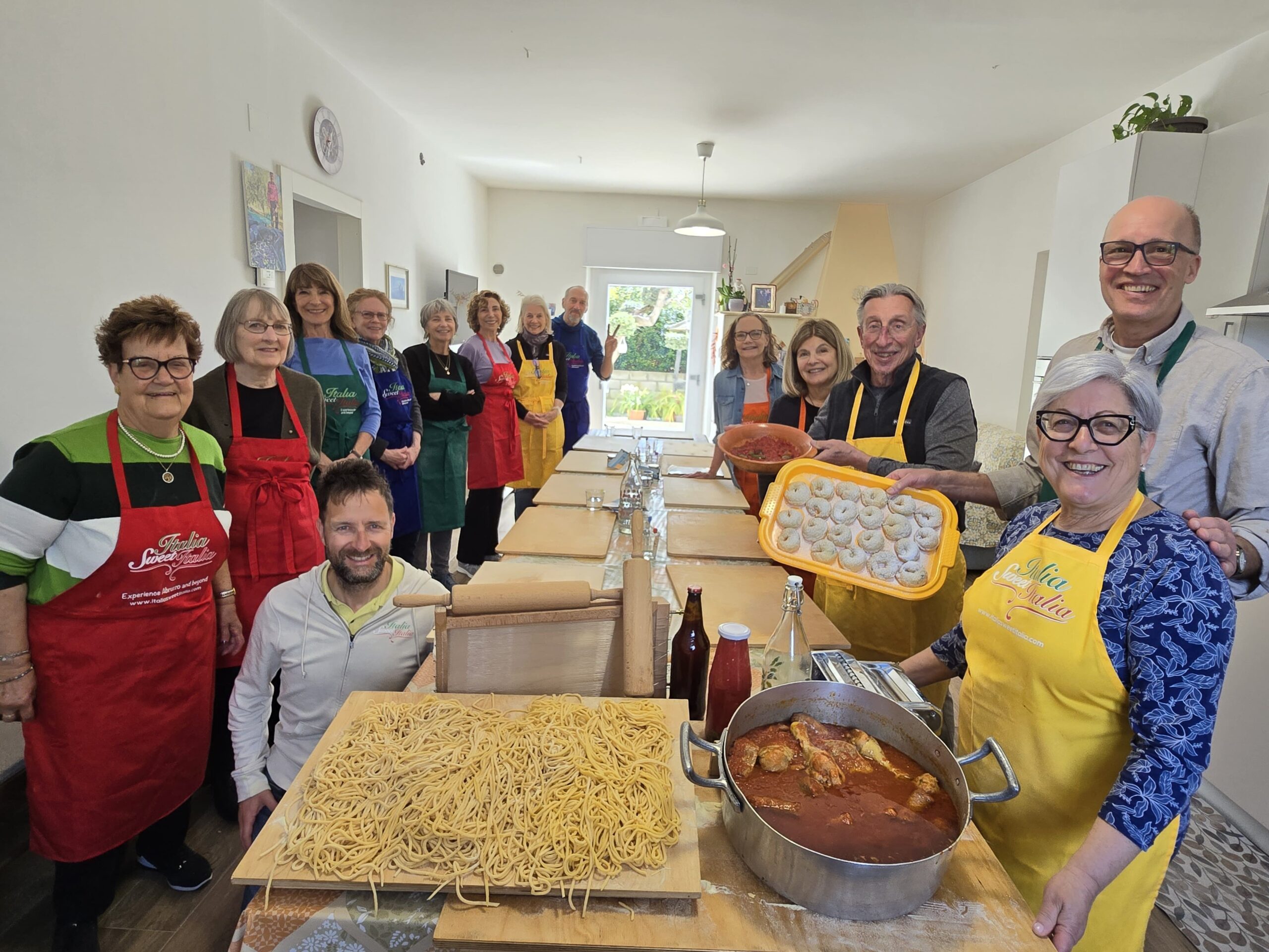 - Join Fabrizio’s family for an exclusive hands-on cooking class at their home. This is more than a lesson; it’s a warm immersion into Italian life, sharing stories and laughter in an atmosphere that our guests consistently rate as their favorite experience. You’ll learn the secrets of “pasta alla chitarra” and traditional sweets.