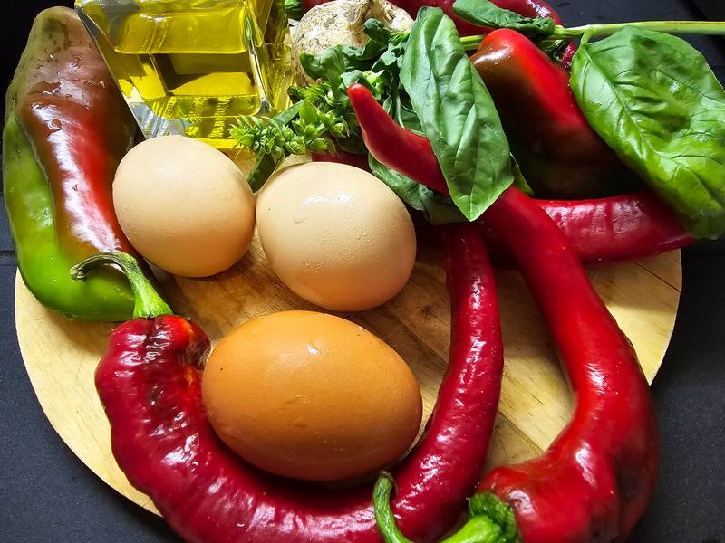 This morning, I had the pleasure of stopping by to see my father, Angelo, and my cousin, also named Angelo. They greeted me with an incredible bounty: beautiful, 100% organic bell peppers, freshly picked from their fields, along with their rich, homegrown extra virgin olive oil, and truly farm-fresh eggs. And, of course, the fragrant basil for today’s dish comes straight from my very own garden!