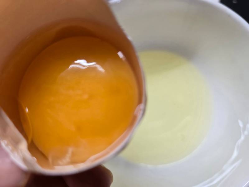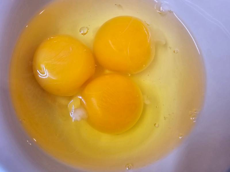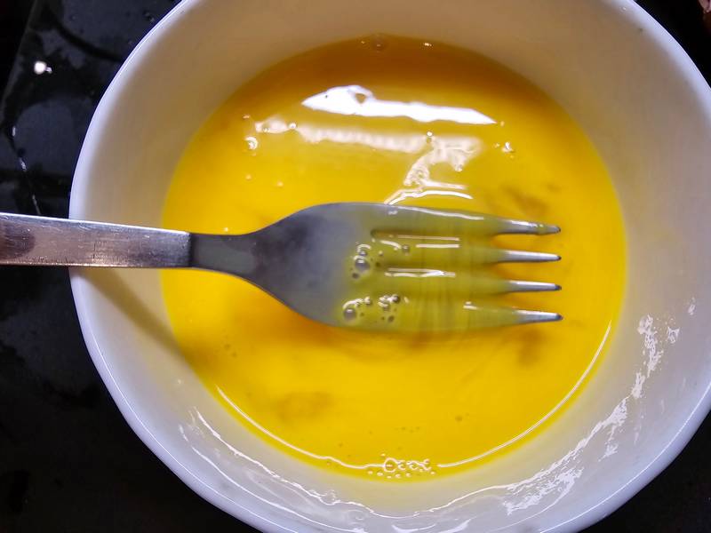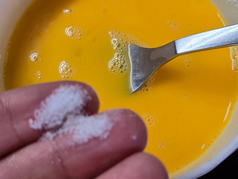 - While the peppers are cooking, crack the eggs into a bowl. Add a pinch of salt and whisk them lightly until the yolks and whites are just combined. You don’t need to over-whisk them.