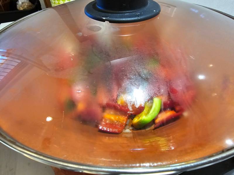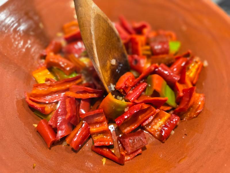 Once the peppers begin to cook, add a good pinch of salt. Continue to cook the peppers for at least 15-20 minutes, or until they’re tender and slightly softened. Cook with the lid on, stirring occasionally to ensure they cook evenly. If the mixture seems too dry, add a small splash of hot water to keep it moist. You’ll know they’re ready when they’ve lost some of their firmness and started to become a bit translucent. Always taste the peppers at this stage – check both the seasoning and the tenderness. You can always add more salt if needed; remember, it’s easier to add than to remove!