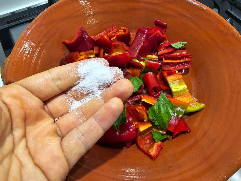 - Prepare the bell peppers: Before adding them to the pan, make sure to wash them thoroughly, then cut them in half and carefully remove all the seeds and the tough, white inner membrane. This white part can be a bit bitter and hard to digest, so it’s best to remove it! Add the cleaned bell peppers, cut into small rectangular shapes, to the skillet. Add the basil leaves now as well.