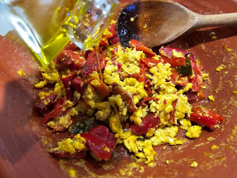 Calculating exact calories can vary slightly based on the specific size of ingredients and amount of extra virgin olive oil used. Here’s a good estimation for the entire recipe (6 eggs, 800g peppers, ~4 tbsp extra virgin olive oil):