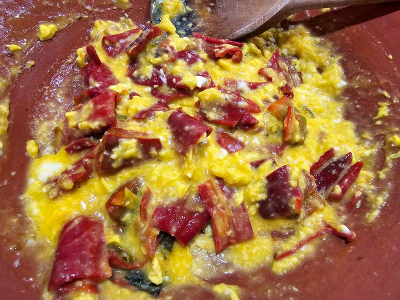 - Once the peppers are cooked to your liking, pour the beaten eggs over them in the skillet.